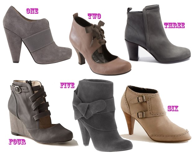 So I’ve let the cat out of the bag that I’ve been having a little trouble practicing what I preach lately. I’ve been weeding out the dead weight in my closet to make room for lighter, brighter staples and trying to make sense of the rest. Suddenly it dawned on me that the missing link right now is a “statement” shoe to perk up my every day outfit. I need something to add that fashionable touch when paired with cropped cargo’s, a floral skirt or skinny jeans. I’ve narrowed my search down to the following criteria: a comfortable bootie with a trendy twist and preferably a neutral grey tone. I’m having trouble deciding which pair to pick so please weigh in on the matter!