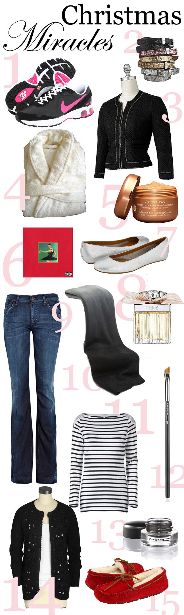 1. Nike Air Max Run Lite 2. New York & Co. Sparkle Skinny Belts 3. Lauren Conrad Embellished Wool Jacket 4. Marrikas Egyptian Cotton Bathrobe 5. Clarins ‘Delicious’ Self-Tanning Cream 6. Kanye West My Beautiful Dark Twisted Fantasy 7. Kors Michael Kors Olympia 8. Chloe ‘Chloe’ Eau de Parfum 9. Citizens of Humanity ‘Hutton’ Mid-Rise Flare Jeans 10. Anne Klein Ombre Scarf 11. Apart Epaulet Bateau Tee 12. M.A.C. 266 Small Angle Brush 13. M.A.C. Fluidline 14. Beyond Vintage Sequin Cardigan 15. Ugg Dakota Slippers