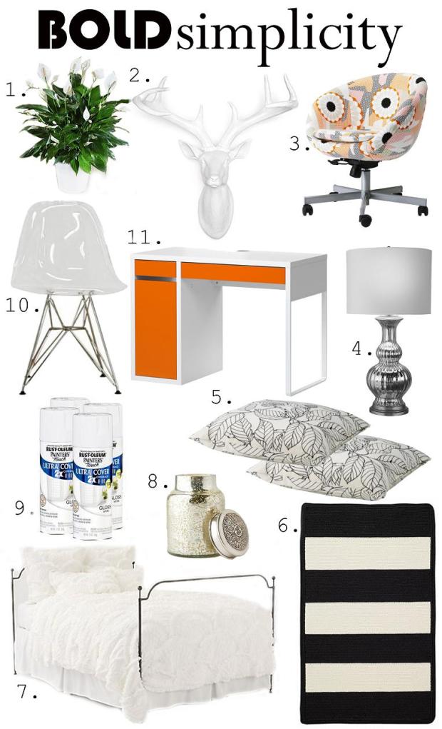 1. Peace Lily 2. Z Gallerie Deer Head 3. IKEA ‘Skruvsta’ Swivel Chair 4. Suzanne Kasler Dalton Mercury Glass Lamp 5. IKEA ‘Stockholm Blad’ Cushions 6. Capel Willoughby Black Rug 7. Anthropologie ‘Rivulets’ Bedding 8. Capri Blue Mercury Glass Candle 9. Rust-Oleum Gloss White Spray Paint 10. Wholesale Interiors Clear Accent Chair 11. IKEA ‘Micke’ Desk