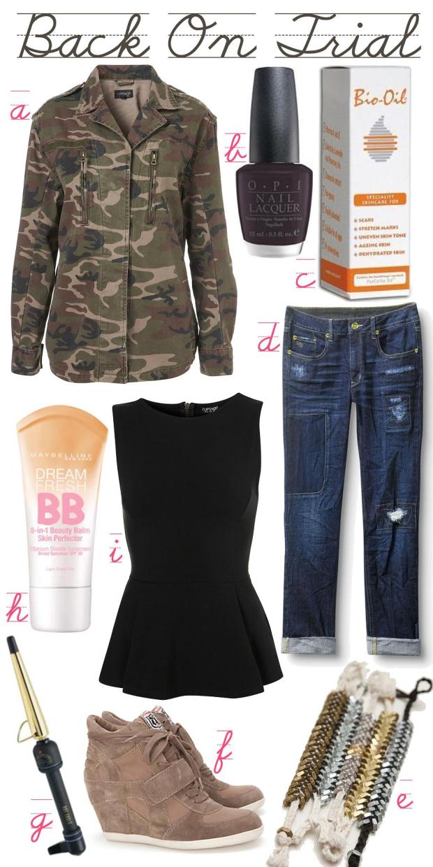 a. Topshop Camo Army Jacket b. O.P.I. polish in Lincoln Park After Dark c. Bio-Oil Treatment & More d. QSW ‘Brewster’ Slim Boyfriend Jeans e. Ravelshop Fishbone Bracelets or D.I.Y. here f. Ash ‘Bowie’ Wedge Sneaker g. Hot Tools Tapered Curling Wand h. Maybelline ‘BB’ Cream i. Topshop Zip Peplum Top